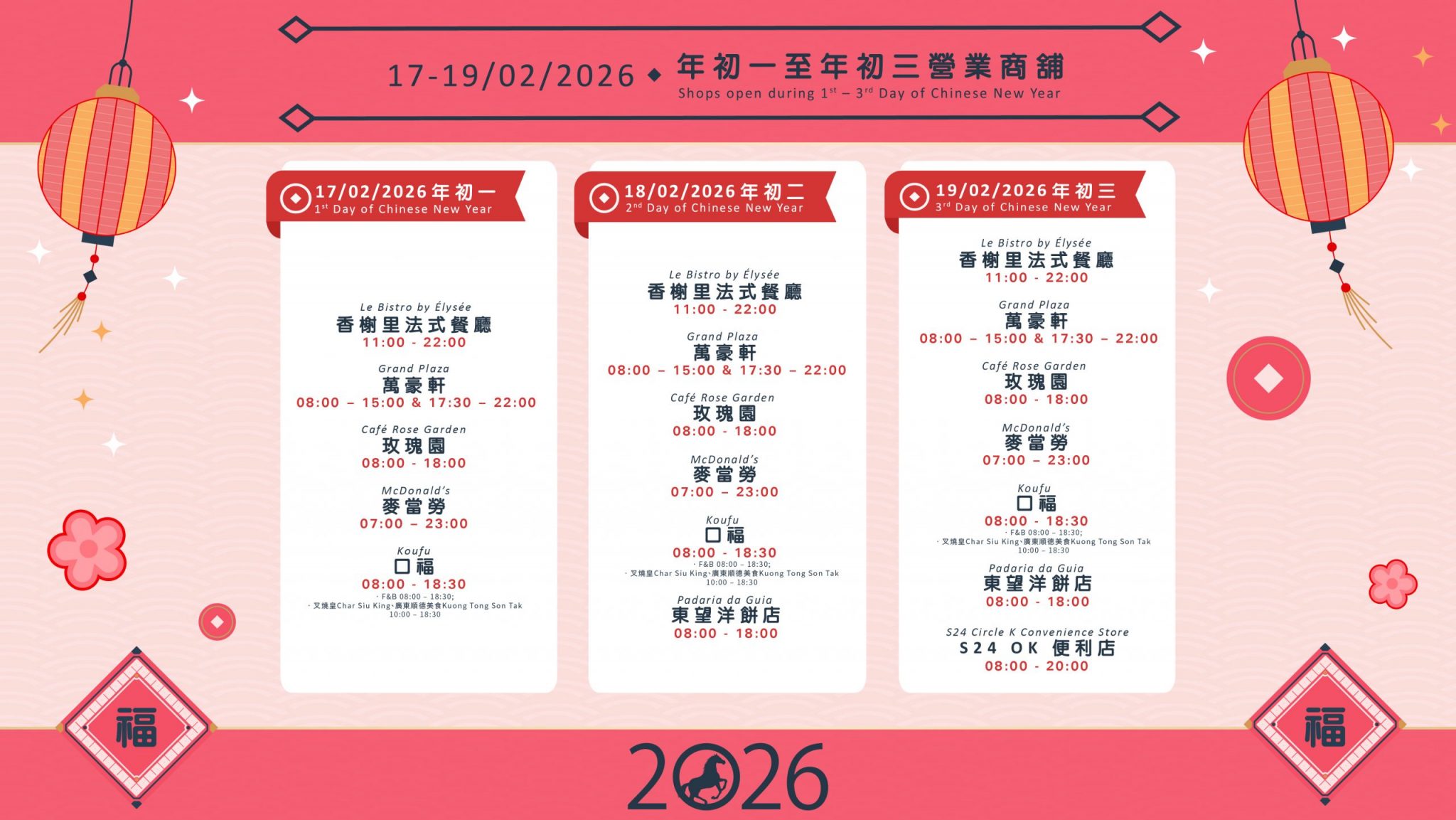 | 東望洋餅店 | S8 薈萃坊 | 星期一至日 07:30 – 22:00 |