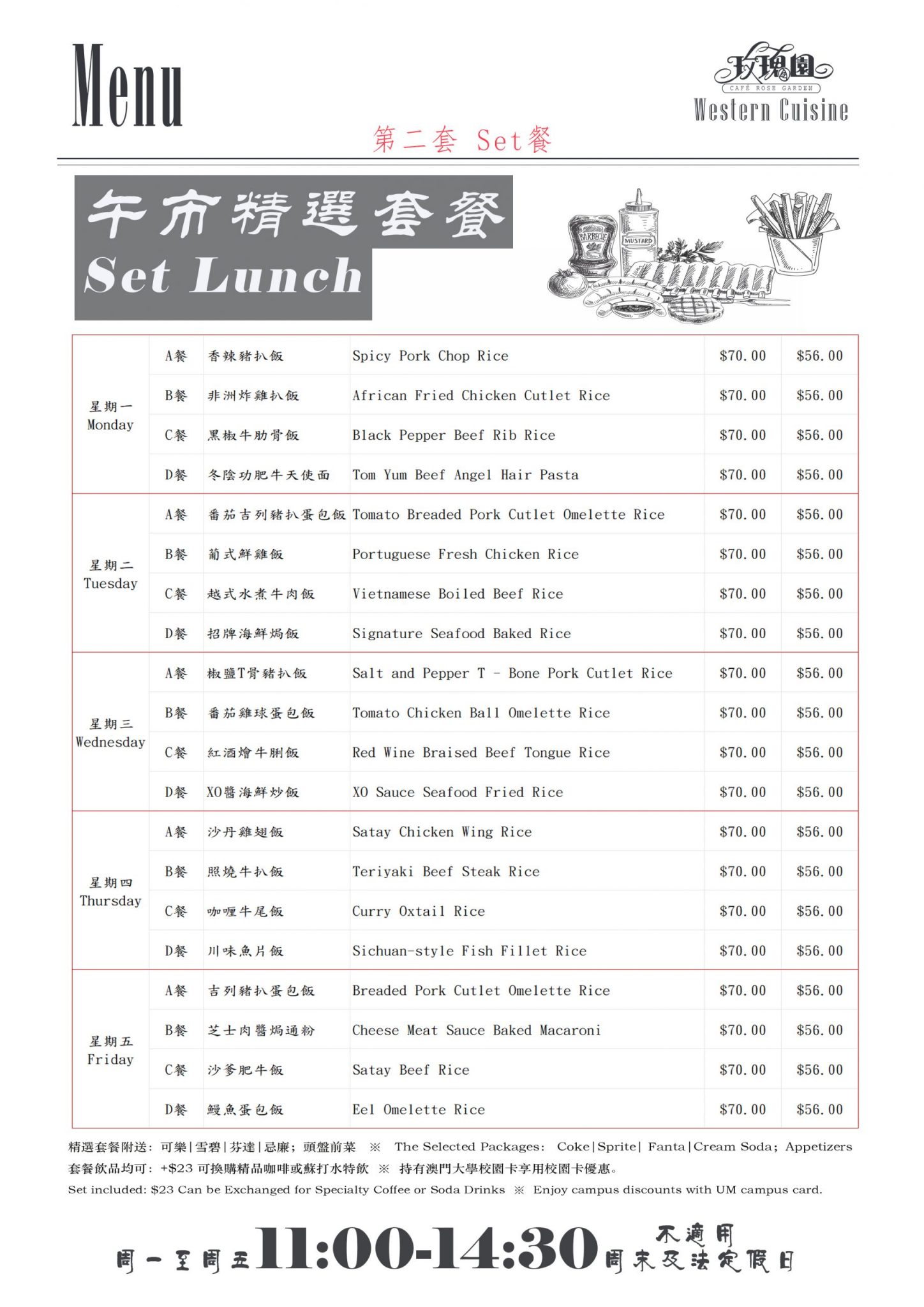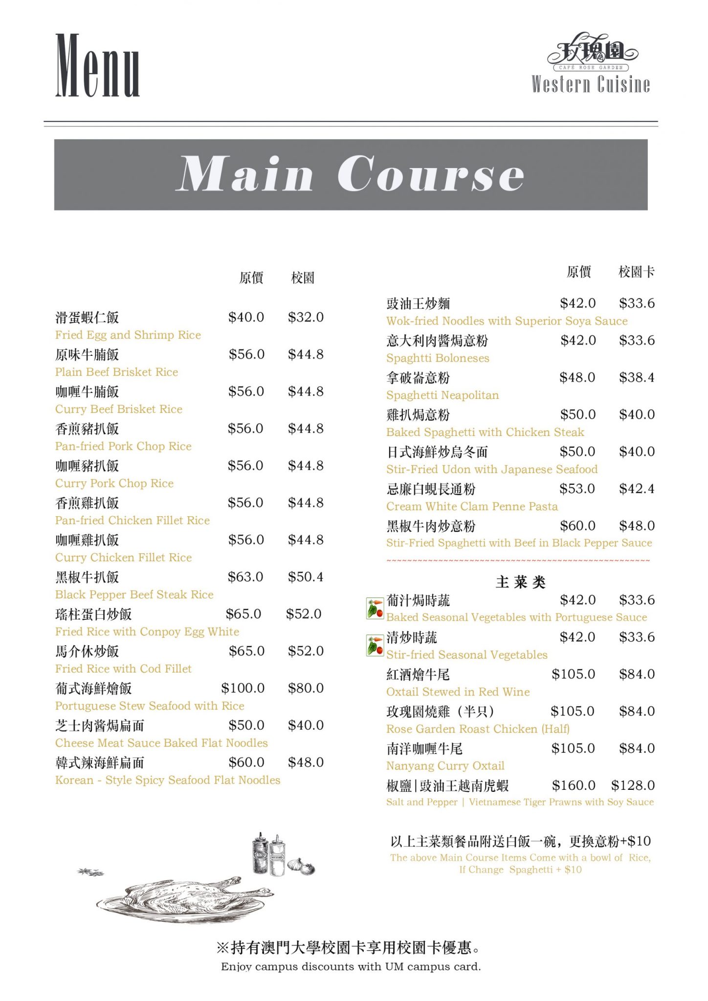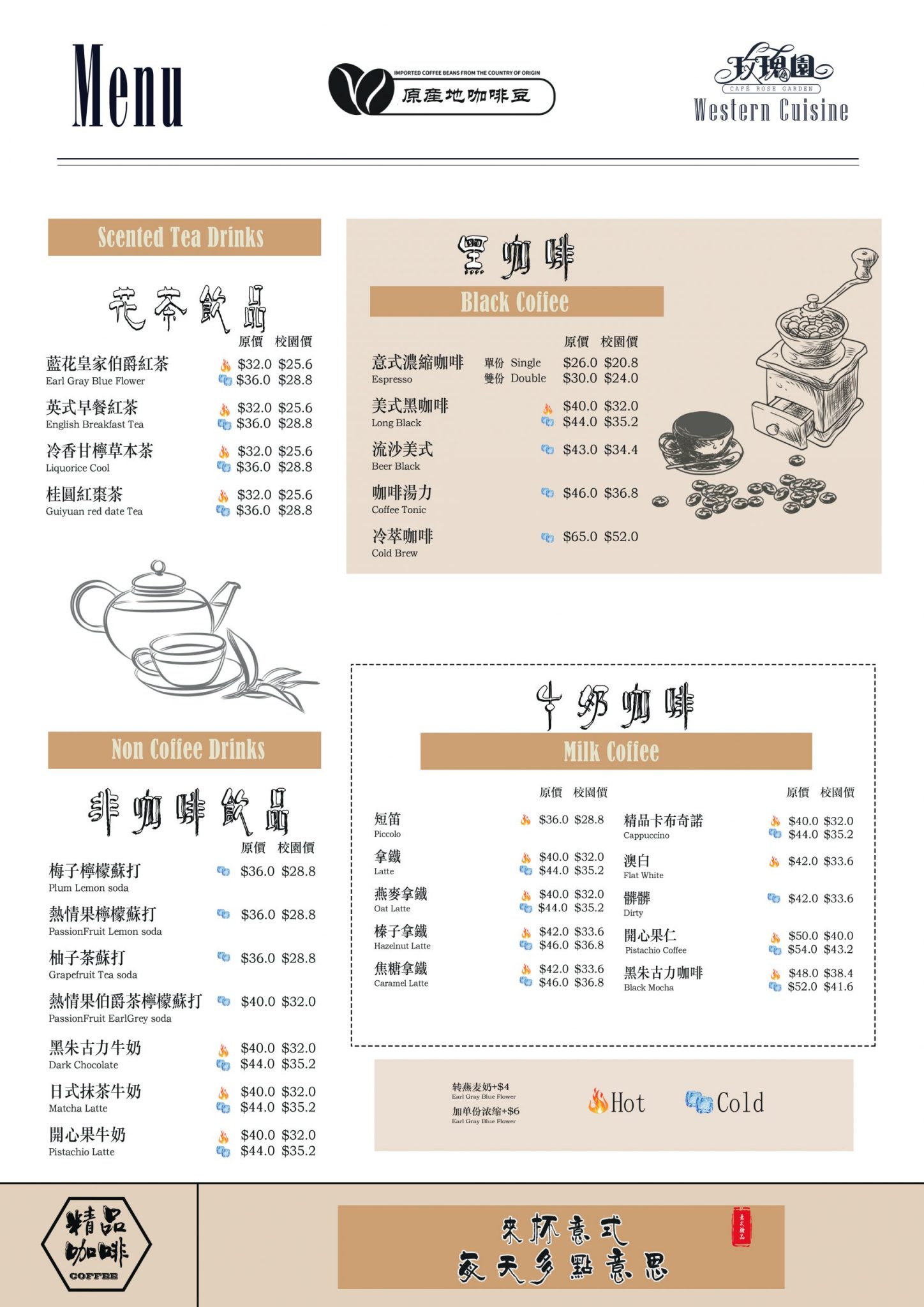 玫瑰園db42599 Lok Chi Weng2026-04-13T12:08:25+08:00 Project Description place E2-G036 access_time 星期一至日 : 08:00 – 22:00 local_phone 2838 6886 以呈現精品咖啡為主打的玫瑰園餐廳位處大學E2圖書館北翼地面層,裝修休閒時尚。從早餐時段開始營業,午餐、下午茶、晚餐多時段提供豐富的精選菜式,包括中西式料理、沙律、輕食、茶飲、咖啡、甜品和烘培。 菜單– 以上餐牌由營運商提供。