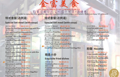Kam Fuyb77467 Wang Ze2026-01-14T10:54:47+08:00 Project Description place S8-1001, 1003 access_time Mon to Sun : 10:00 – 22:00 local_phone 6591 2117 (Kou Fu Food Court) Kam Fu offers delicious Chinese-style dishes and various fried noodles and rice. Menu. The above menus are provided by the operator.